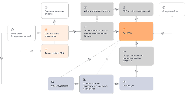 Для решения этой задачи мы выступили в роли партнёра по операционной и логистической деятельности. Для этого разработали несколько интеграционных модулей и проработали схему взаимодействия между магазином клиента, OmniCRM, поставщиками, складами, транспортными компаниями и системами отчётности.
